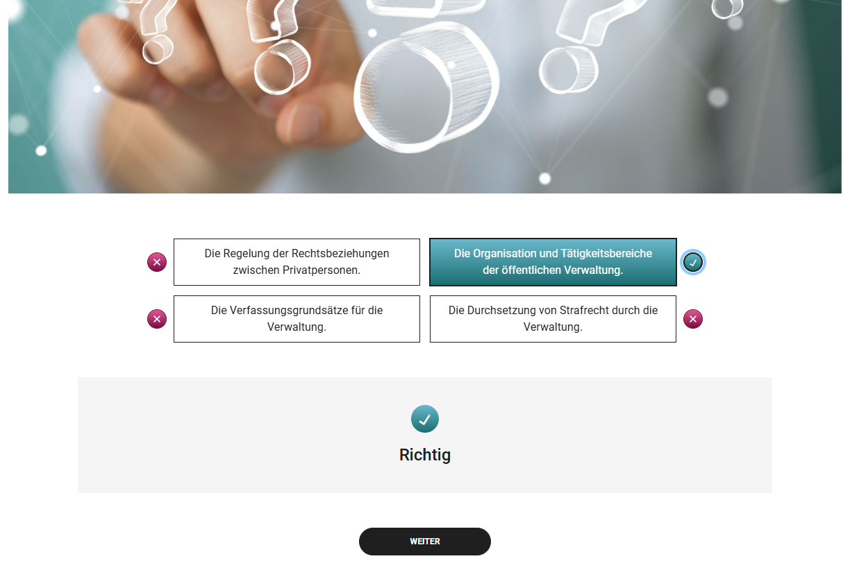Das barrierefreie WBT „Verwaltungsrecht“ vermittelt die grundlegenden Prinzipien des Verwaltungsrechts, einschließlich der wichtigsten Grundsätze und der Besonderheiten des öffentlichen Dienstes. Es behandelt das Verwaltungsverfahren, den Rechtsschutz sowie ausgewählte Bereiche des besonderen Verwaltungsrechts und zeigt praxisnahe Anwendungsfälle.